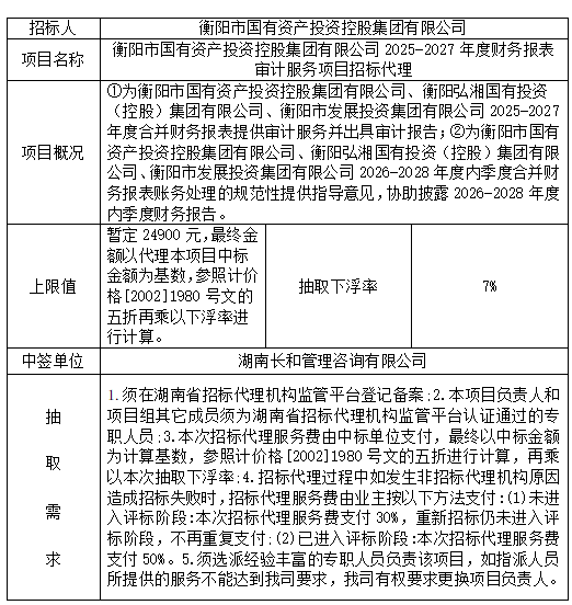 衡陽市國有資產(chǎn)投資控股集團(tuán)有限公司2025-2027年度財務(wù)報表審計服務(wù)項目招標(biāo)代理抽取結(jié)果公示